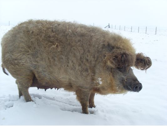 | Blondes Wollschwein mit Ferkeln | Blondes Wollschwein im Schnee |